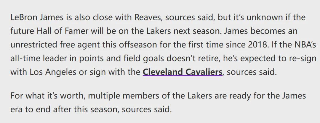 Ashish Mathur在报道中透露,多位湖人球员和管理层已经做好准备,在今年夏天迎接詹姆斯时代的终结。昨天教主刚刚写过,今年夏天,里夫斯跳出合同成为自由球员,詹姆斯的合同届时也将到期,湖人管理层很难同时留下他俩。