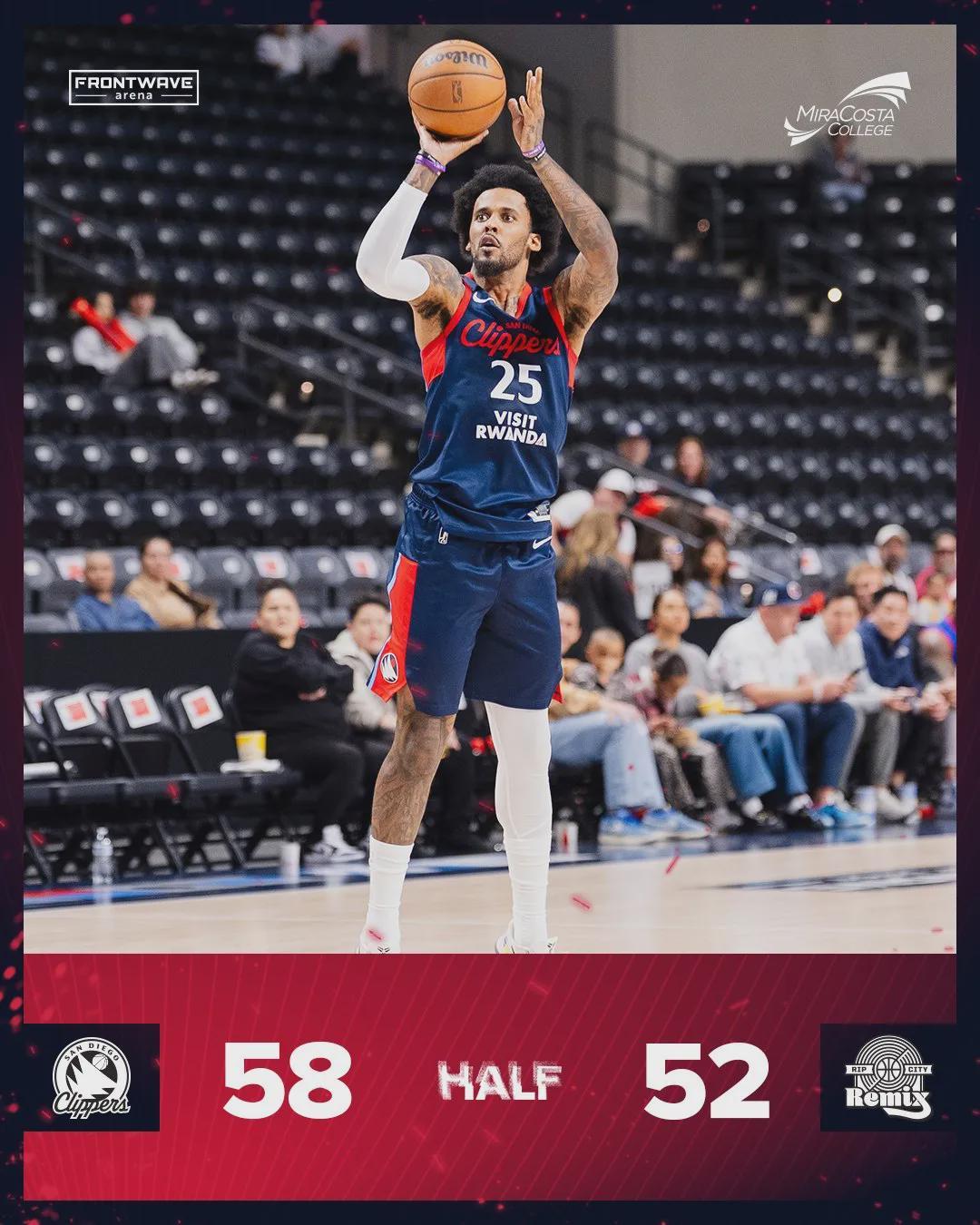 上半场打完,圣迭戈快船58-52反超混音队6分。杨瀚森出战15分钟,8投8中,三分1中1,砍下17分3篮板2助攻1抢断0失误,正负值+7全队最高。快船中锋弗里曼托15中8拿到18分6板2助,小泰泰-华盛顿10中8砍下17分7助。