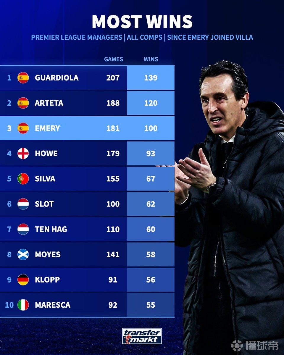 埃梅里接手维拉后181战100胜,同期英超主帅仅次于瓜帅塔帅